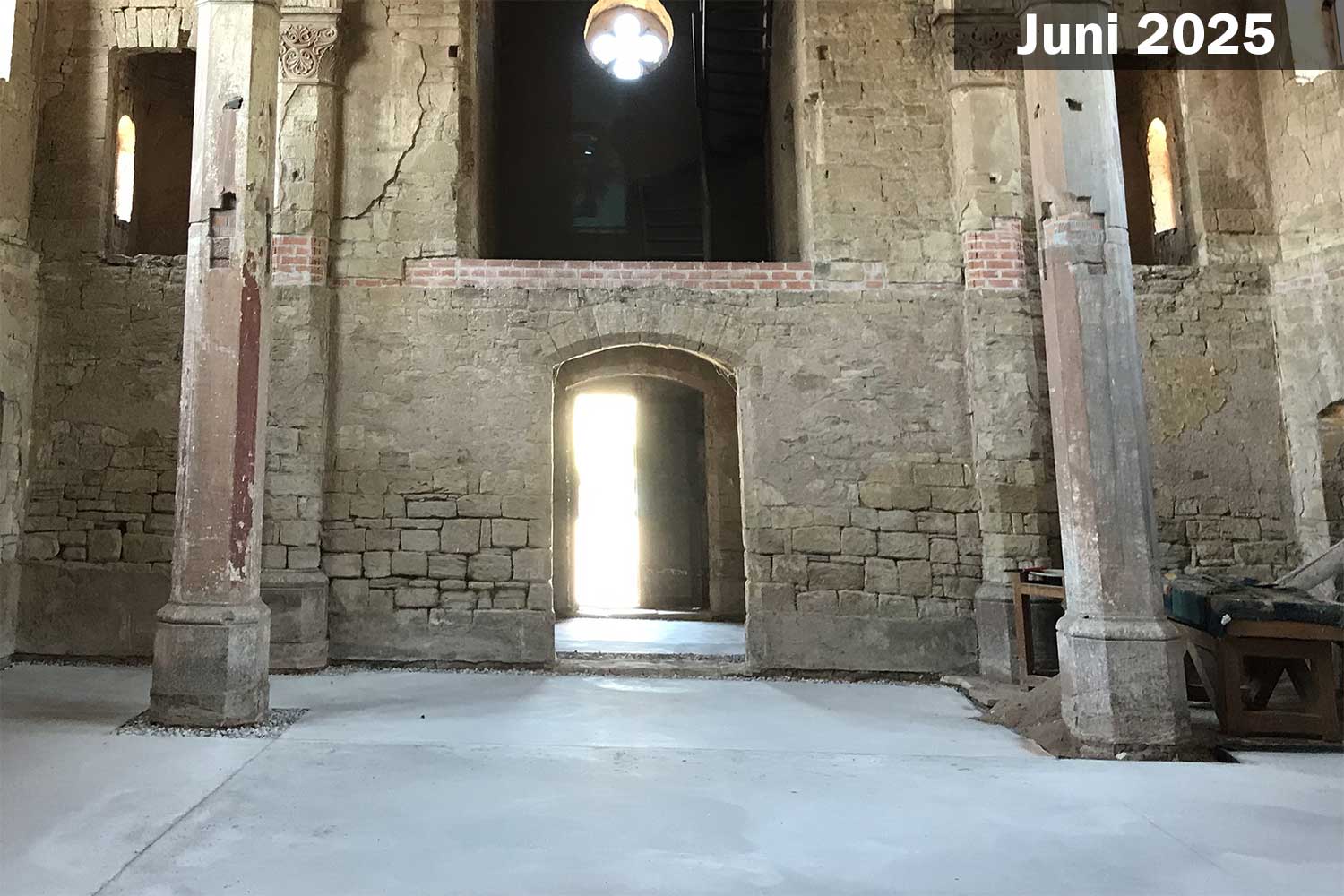 In einem ersten Kraftakt wurde die Kirche zunächst entrümpelt, die Tauben wurden vertrieben und das Dach abgedichtet. Ein besonderer Fokus lag zuletzt auf der Wiederherstellung des Fußbodens und der Erneuerung der Eingänge. Im Winter 2024/2025 wurde der alte Bauschutt entfernt, der historische Sand-Unterbau im Kirchenschiff durfte bleiben.