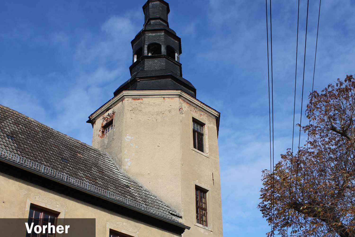 Durch ein undichtes Dach war Feuchtigkeit eingedrungen und hatte das Gebälk so mürbe gemacht, dass sich die gesamte Konstruktion bereits gefährlich verformt hatte. Die gesamte Last wurde so gerade noch über den Glockenstuhl ins Innere abgeleitet. 2015 drohte die Turmbekrönung abzustürzen und musste schließlich per Kran abgenommen werden.