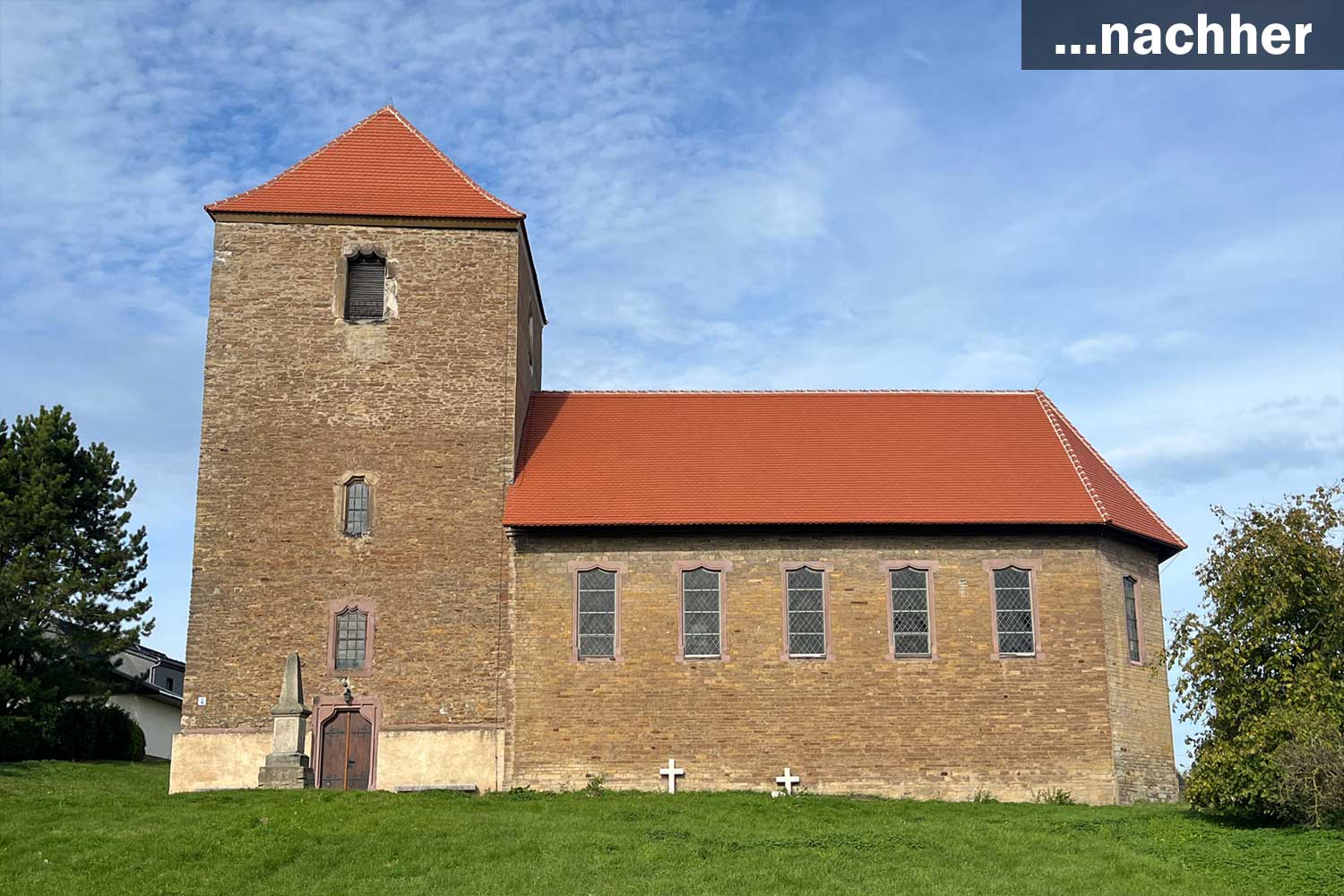 Die Kirchengemeinde ging die Sanierung in mehreren Abschnitten an. Bereits 2018 wurde eine so genannte Geländeregulierung zur Reduzierung der Feuchtigkeit im Mauerwerk durchgeführt und der Sockel instandgesetzt. Drei Jahre später konnten das Turmdach und ein Teilabschnitt der Kirchenschiffdachs in eine Biberschwanz-Doppeldeckung neu gedeckt werden. Jetzt ist mit der vollständigen Dachinstandsetzung des Kirchenschiffes auch der dritte und letzte Bauabschnitt erfolgreich abgeschlossen. Das war auch dringend notwendig, denn die Schäden waren weiter fortgeschritten.